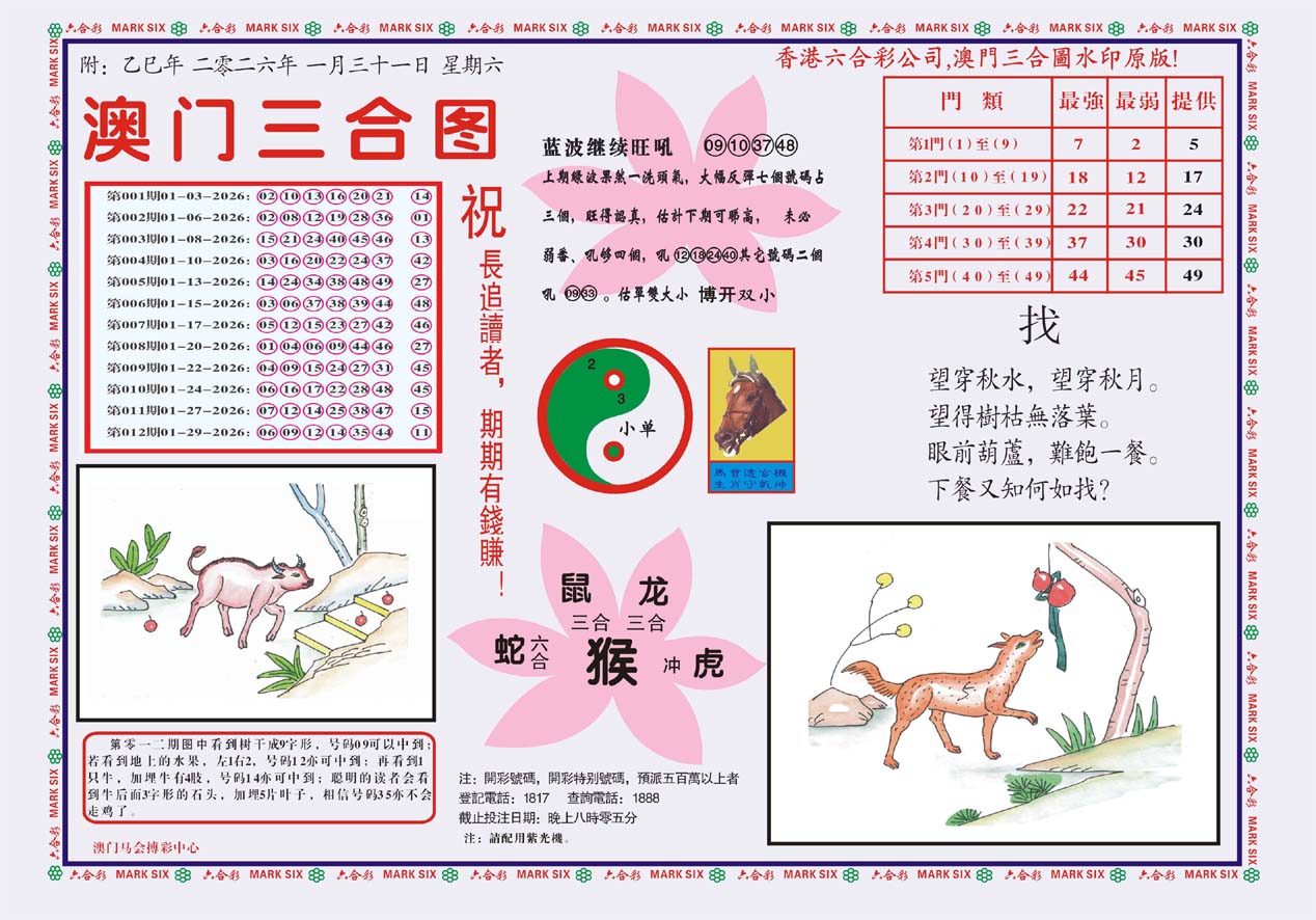 标签: 说明:提供最快、最新、最全的彩色正版全年图纸新闻资讯,同时还提供六合港彩开奖时时在线直播、平特码数据生肖大小单双等走势分析、六合港彩及彩票开奖新闻资讯以及专家心水推荐等。